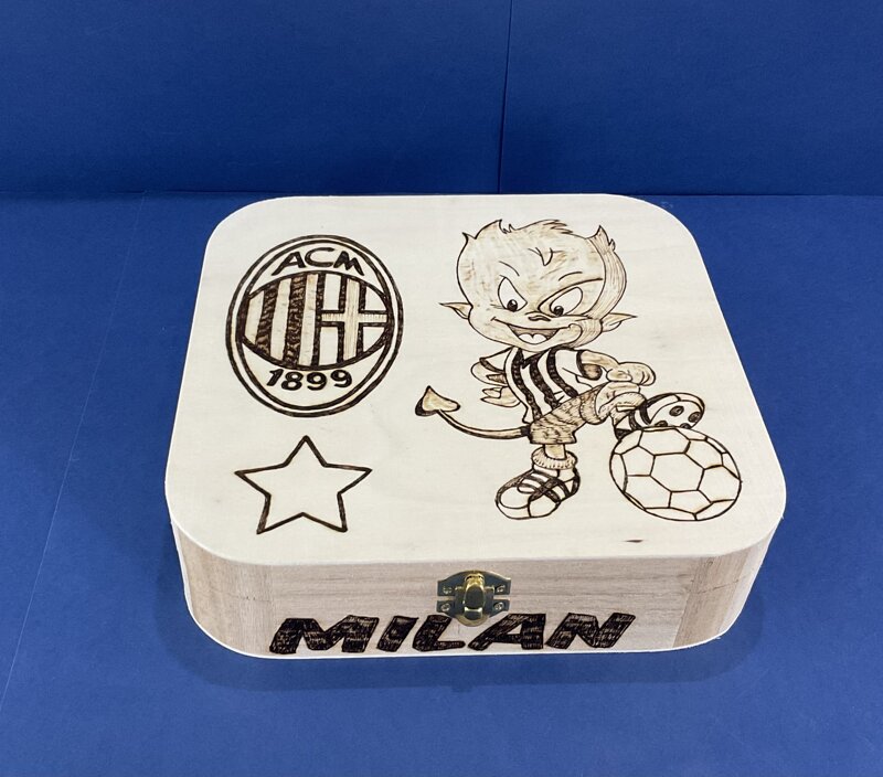cofanetto legno quadrato disegno calcio con chiusura metallica