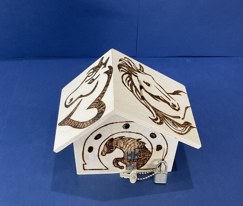 salvadanaio legno a casetta con portina e lucchetto disegno cavallo
