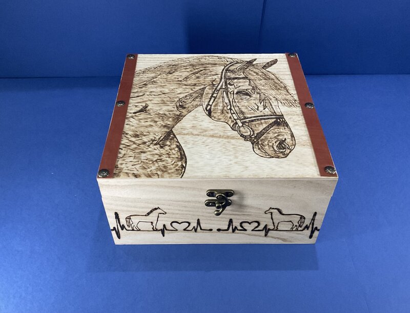 cofanetto legno finitura pelle disegno cavallo con chiusura metallica