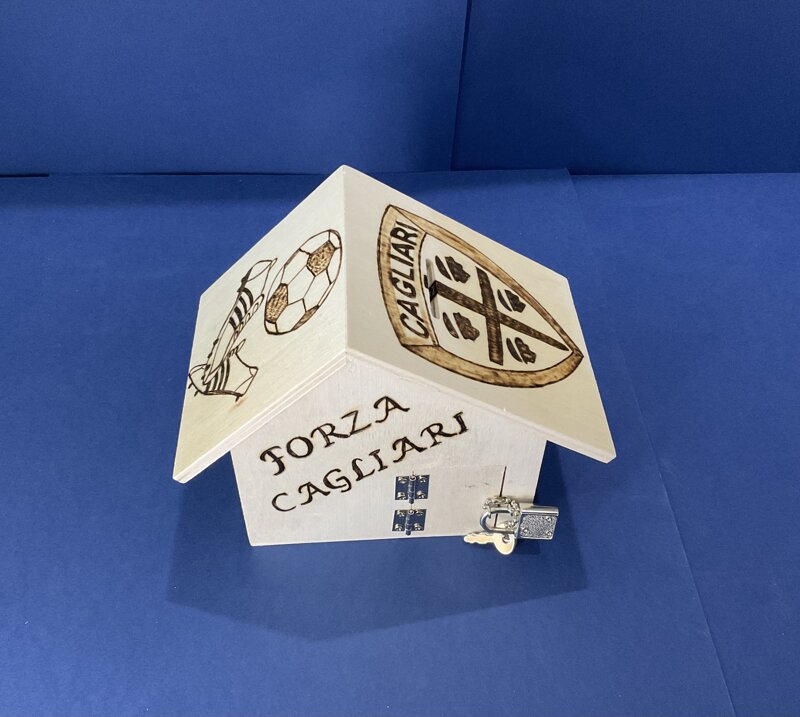 salvadanaio legno a casetta con portina e lucchetto disegno calcio