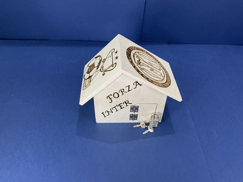 salvadanaio legno a casetta con portina e lucchetto disegno calcio