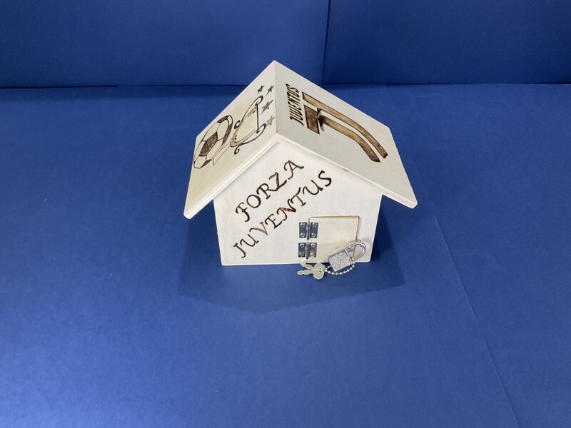 salvadanaio legno a casetta con portina e lucchetto disegno calcio