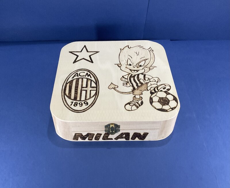 cofanetto legno quadrato disegno calcio con chiusura metallica