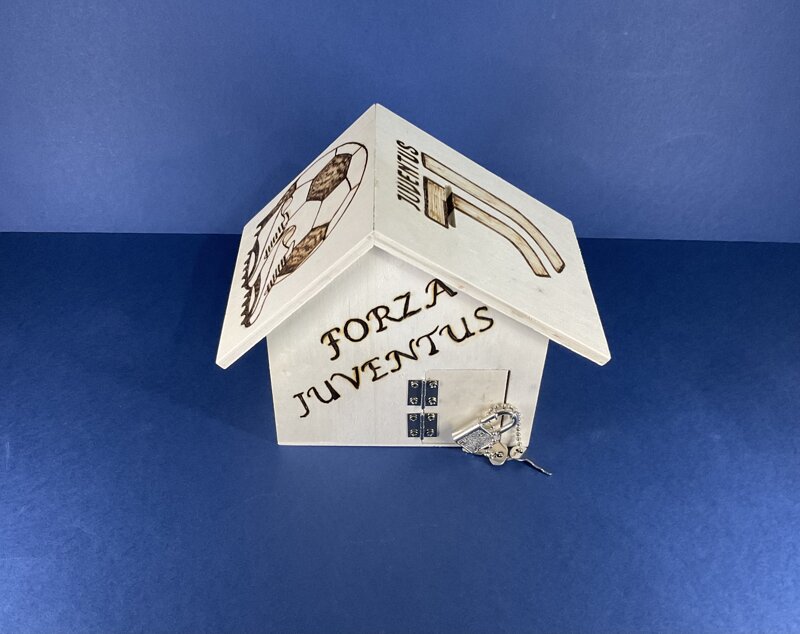 salvadanaio legno a casetta con portina e lucchetto disegno calcio