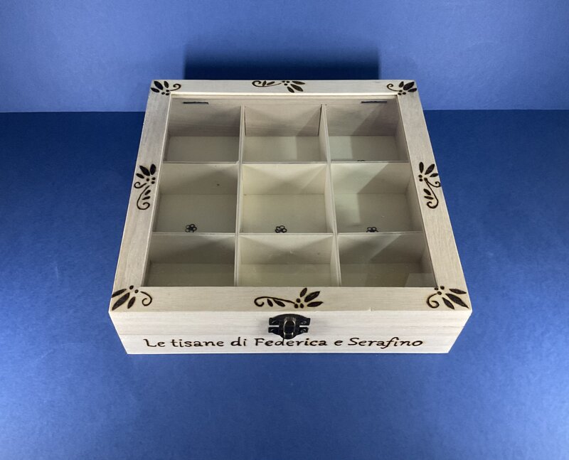 portatisane legno vetro 9 scomparti disegno tazze con chiusura metallica