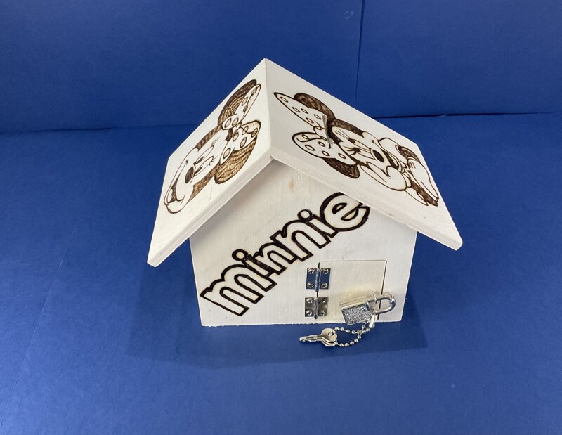 salvadanaio legno a casetta con portina e lucchetto disegno cartoni animati