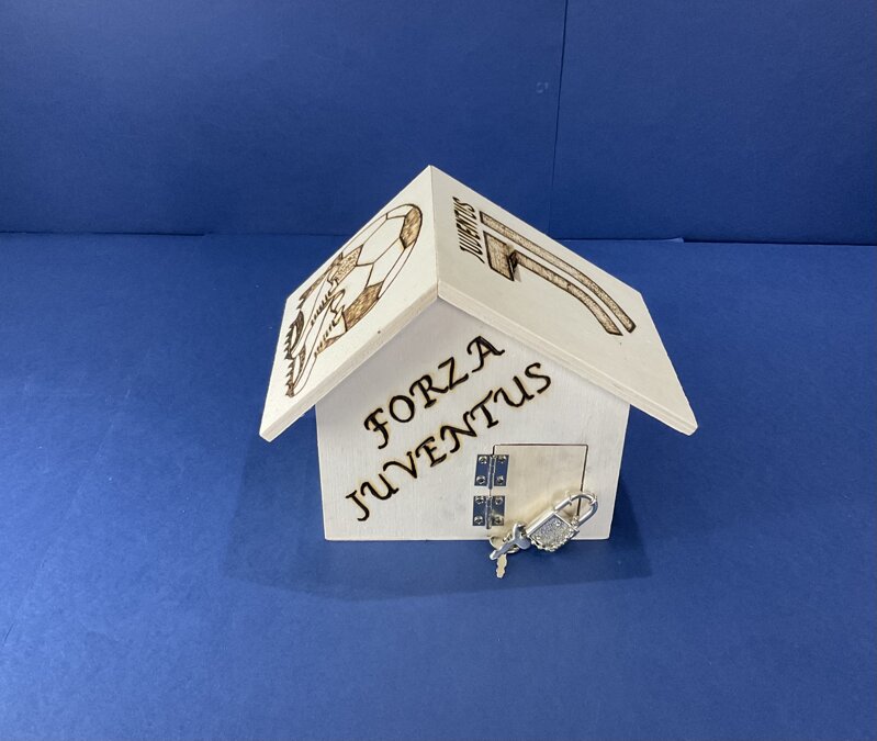salvadanaio legno a casetta con portina e lucchetto disegno calcio