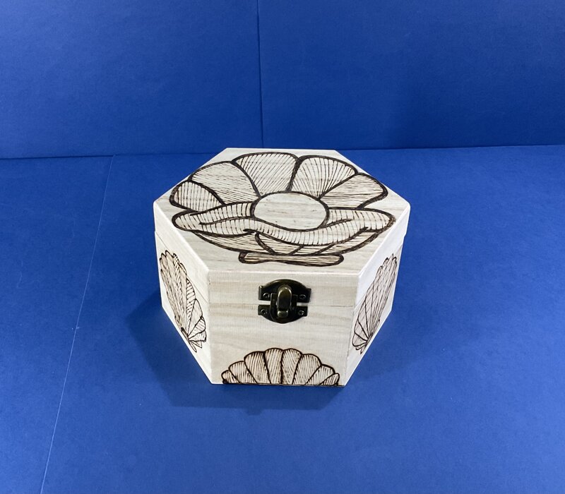 cofanetto legno esagonale disegno conchiglia con chiusura metallica