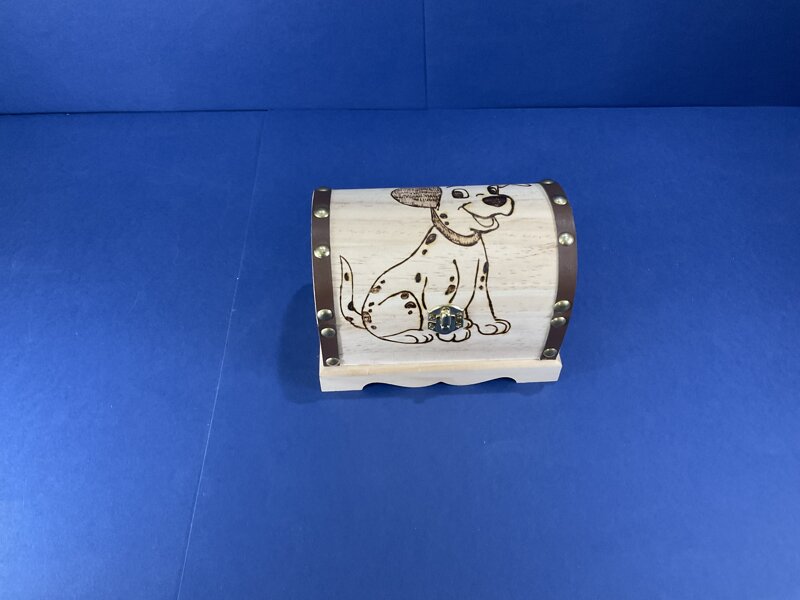 cofanetto legno a scrigno finitura marron disegno cagnolino con chiusura metallica