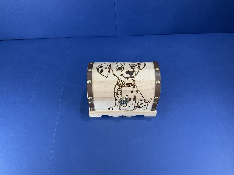 cofanetto legno a scrigno finitura marron disegno cagnolino con chiusura metallica