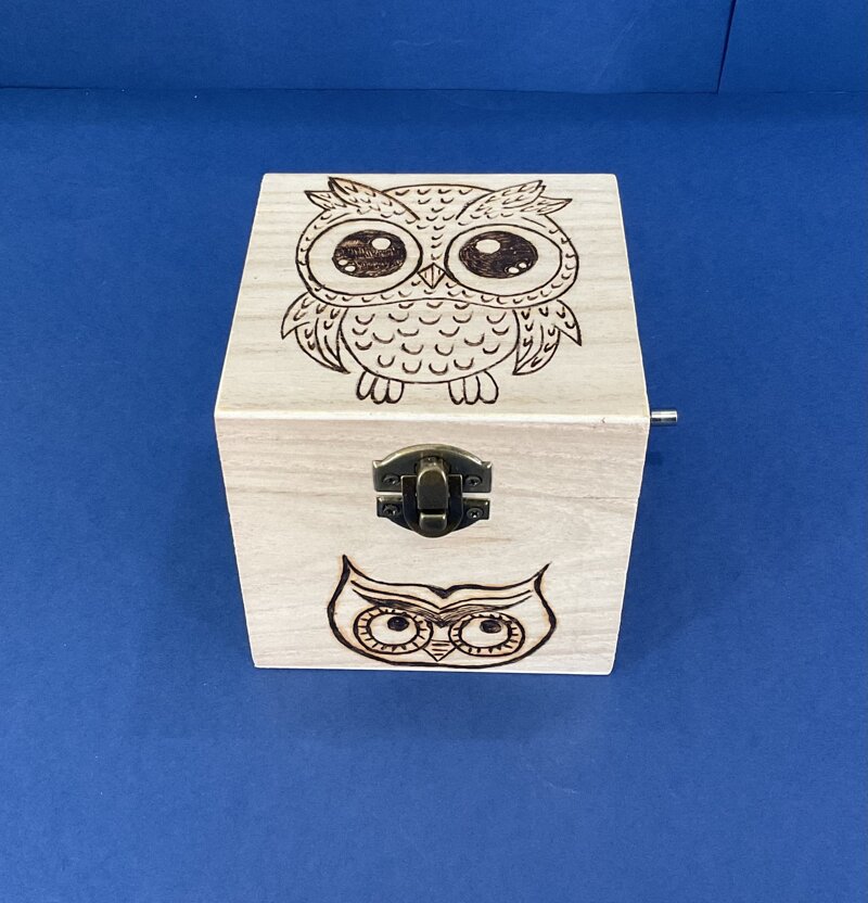 cofanetto legno carillon disegno gufetto musica varia con chiusura metallica