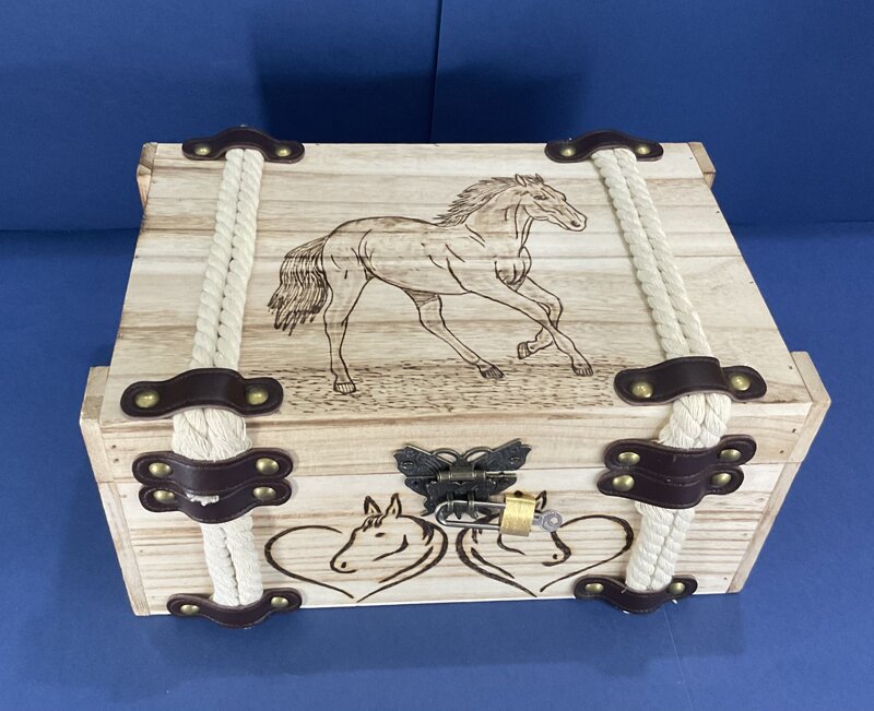 cofanetto finitura corda maniglie metalliche disegno cavallo con chiusura metallica