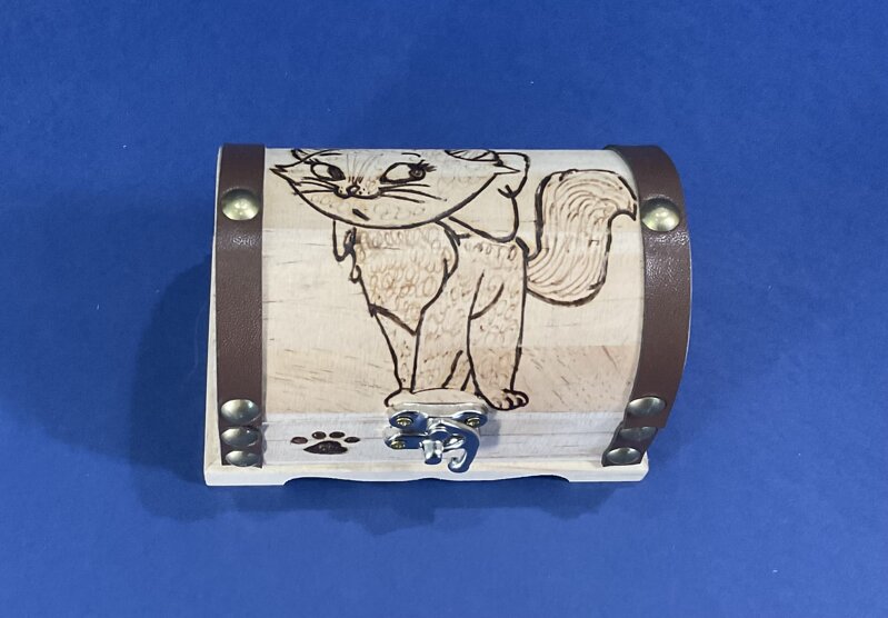 cofanetto legno a scrigno finitura marron disegno gattino con chiusura metallica