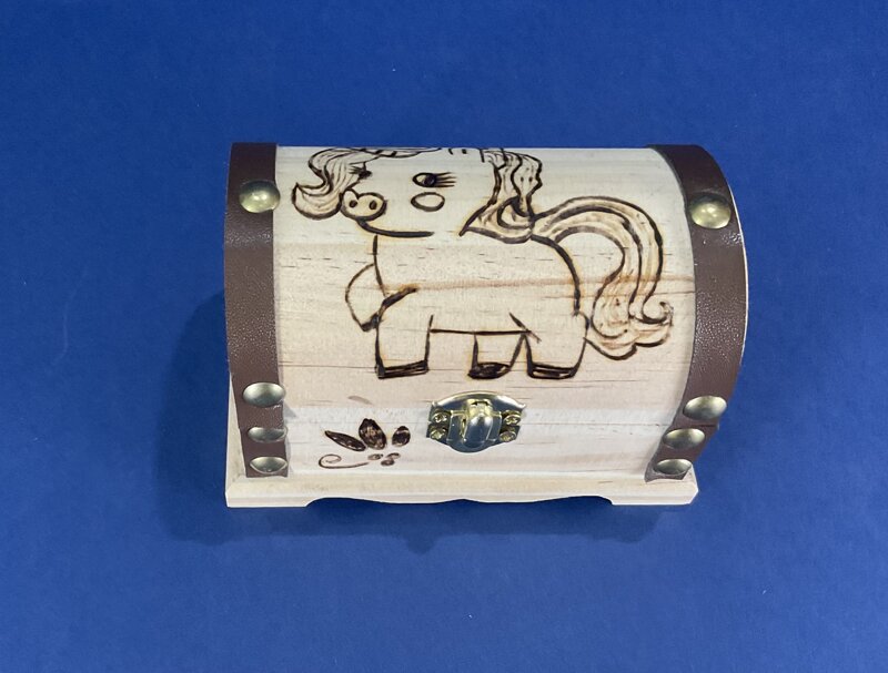 cofanetto legno a scrigno finitura marron disegno cartoni animati con chiusura metallica