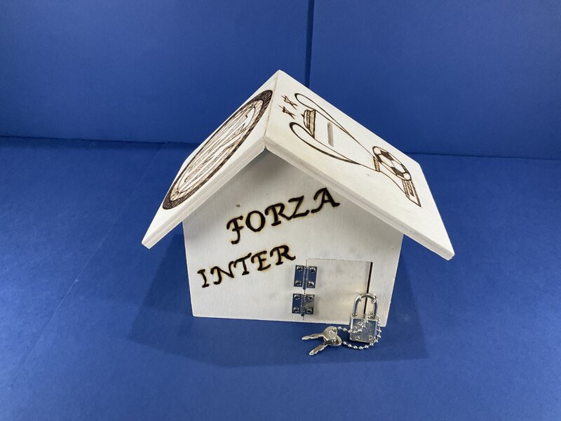 salvadanaio legno a casetta con portina e lucchetto disegno calcio