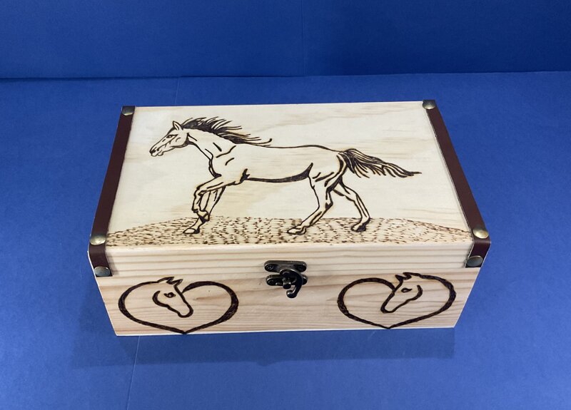 cofanetto legno finitura pelle disegno cavallo con chiusura metallica