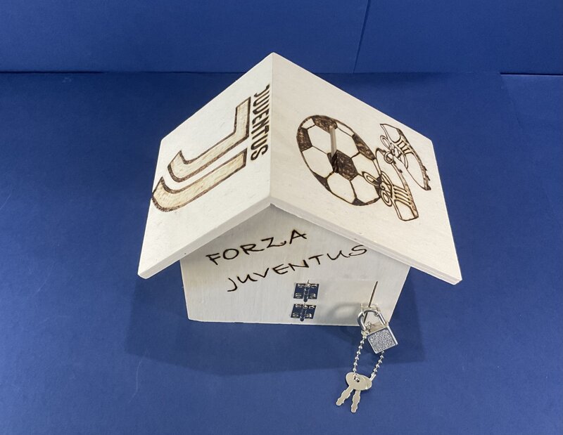 salvadanaio legno a casetta con portina e lucchetto disegno calcio