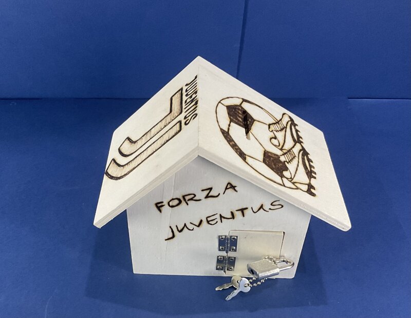 salvadanaio legno a casetta con portina e lucchetto disegno calcio