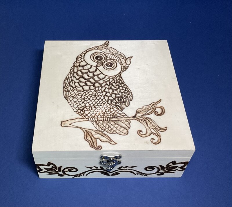 cofanetto legno, disegno gufo, con chiusura metallica.