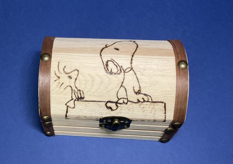 cofanetto legno a scrigno, disegno cartoni animati, con chiusura metallica.