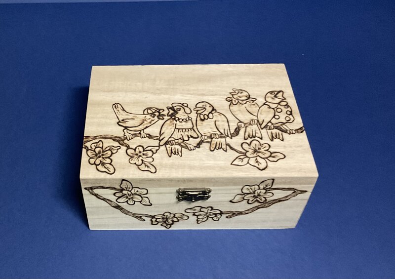 cofanetto legno, disegno uccellini, con chiusura metallica.