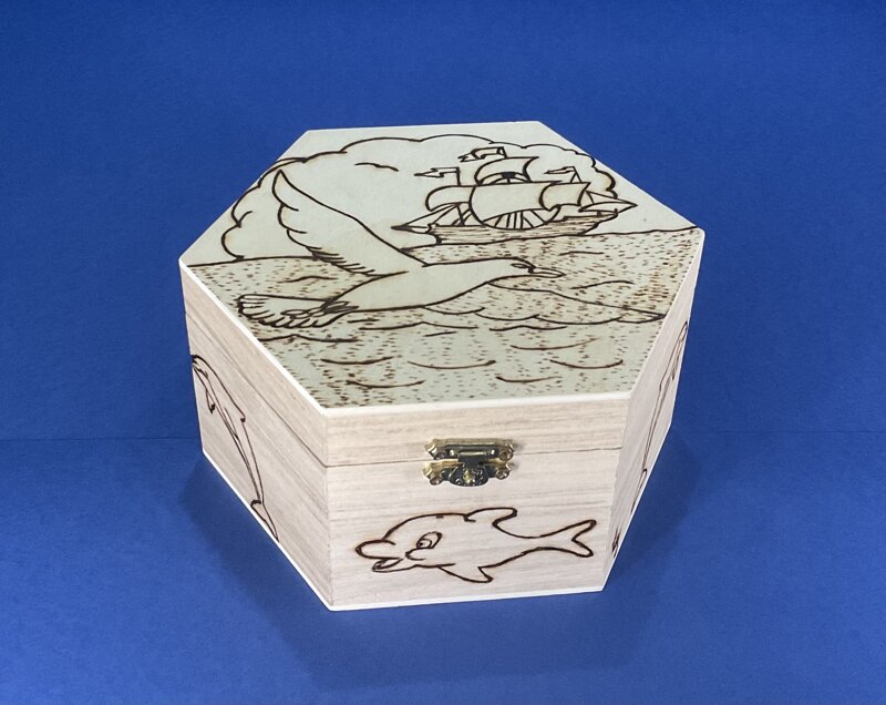 cofanetto esagonale legno, disegno gabbiano, con chiusura metallica.