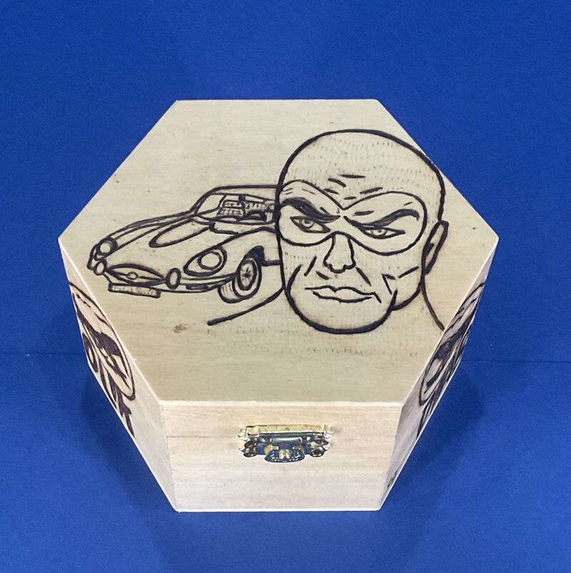cofanetto esagonale legno, disegno cartoni animati, con chiusura metallica.