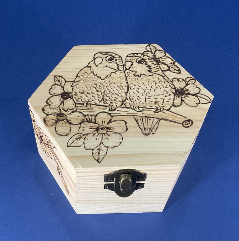 cofanetto esagonale legno, disegno uccellini, con chiusura metallica.
