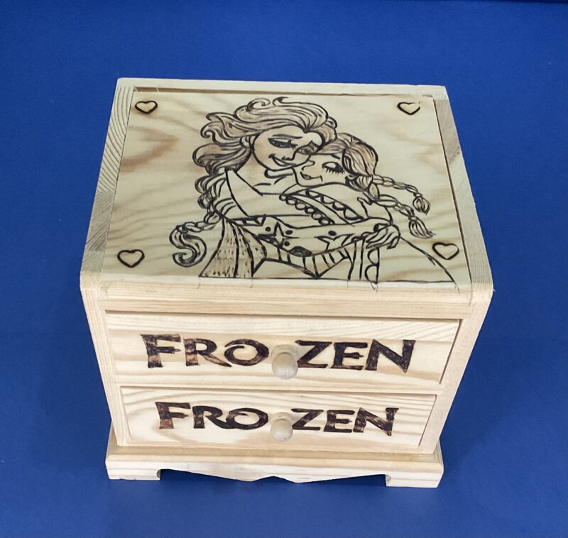 cassettiera legno 2 cassetti con ribalta e specchio, disegno cartoni animati.