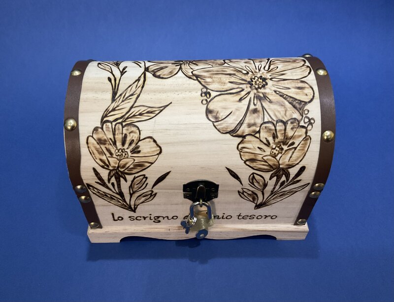 cofanetto legno a scrigno, disegno floreale, con chiusura metallica e lucchetto.