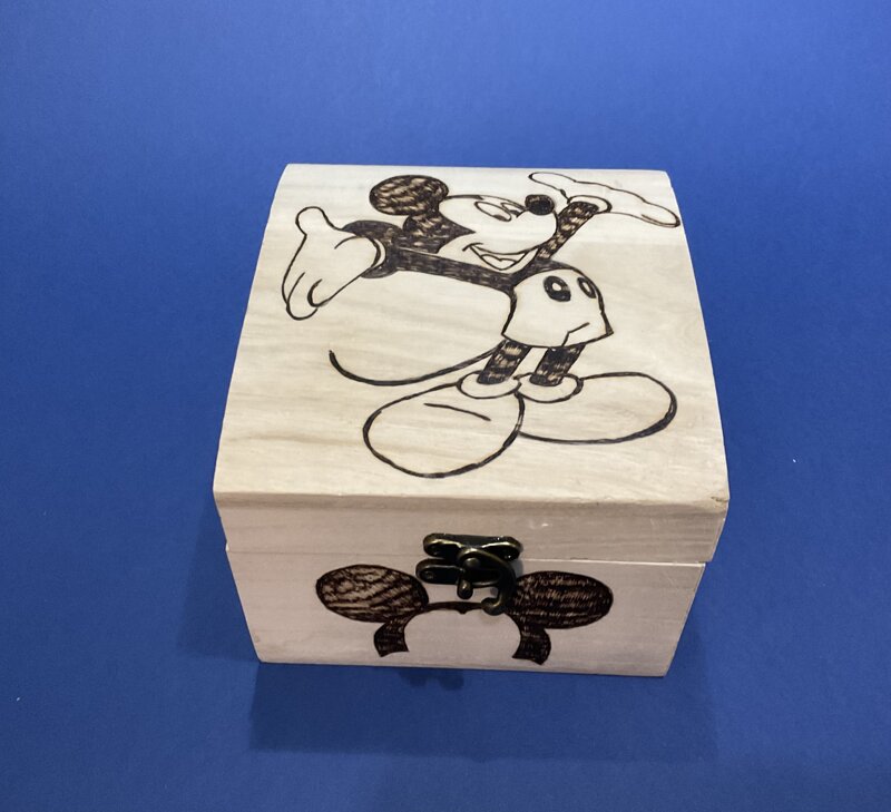 cofanetto legno, disegno cartoni animati, con chiusura metallica.