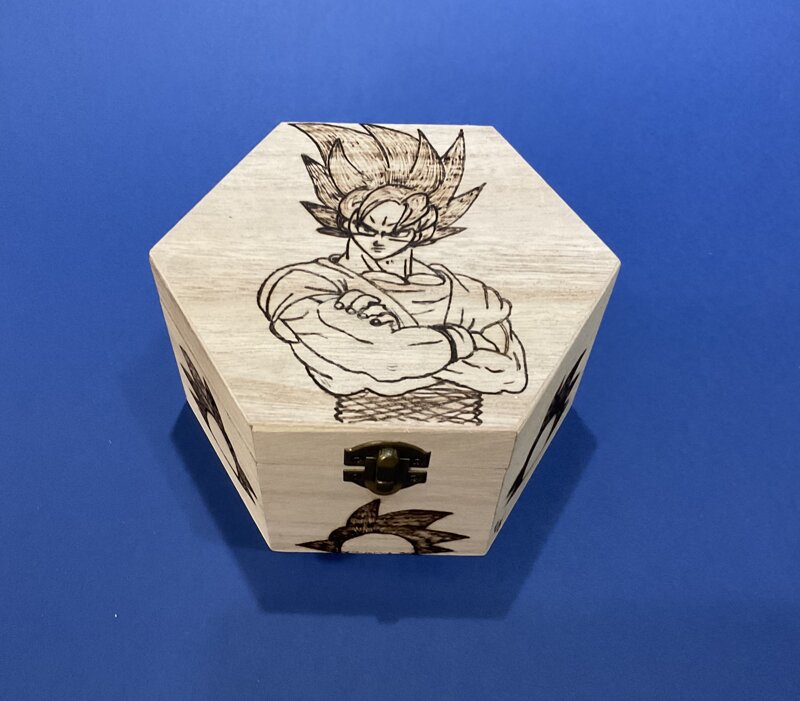 cofanetto esagonale legno, disegno cartoni animati, con chiusura metallica.