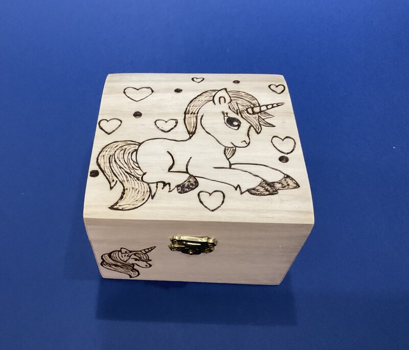 cofanetto legno, disegno cartoni animati, con chiusura metallica.