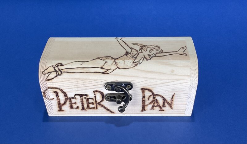 Cofanetto bombato legno, disegno cartoni animati, con chiusura metallica.