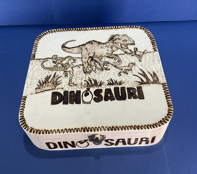 cofanetto legno, disegno dinosauri, con chiusura metallica.