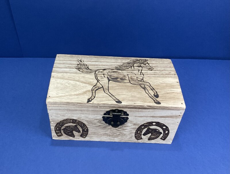 cofanetto legno bombato, disegno cavallo, con chiusura metallica.