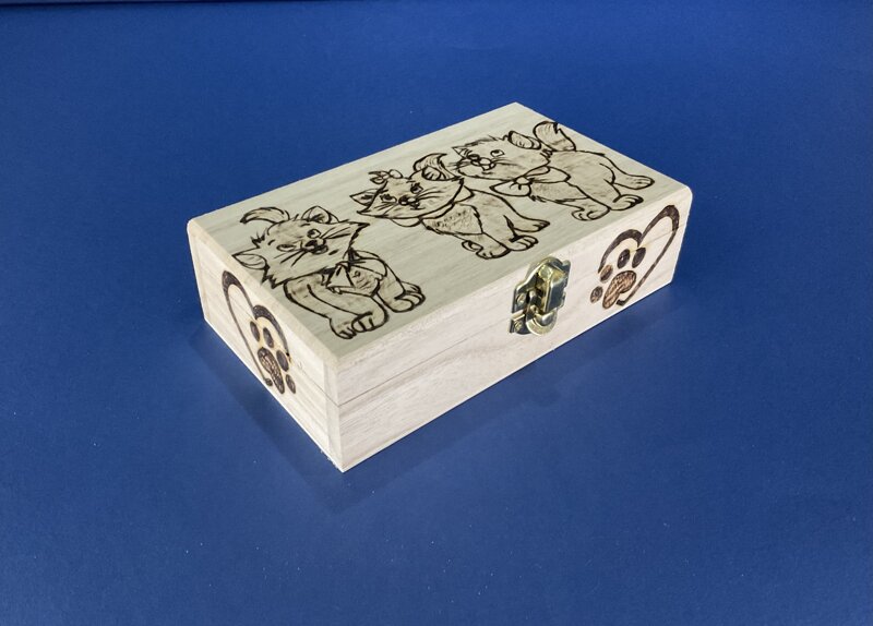 cofanetto legno, disegno 3 gattini, con chiusura metallica.