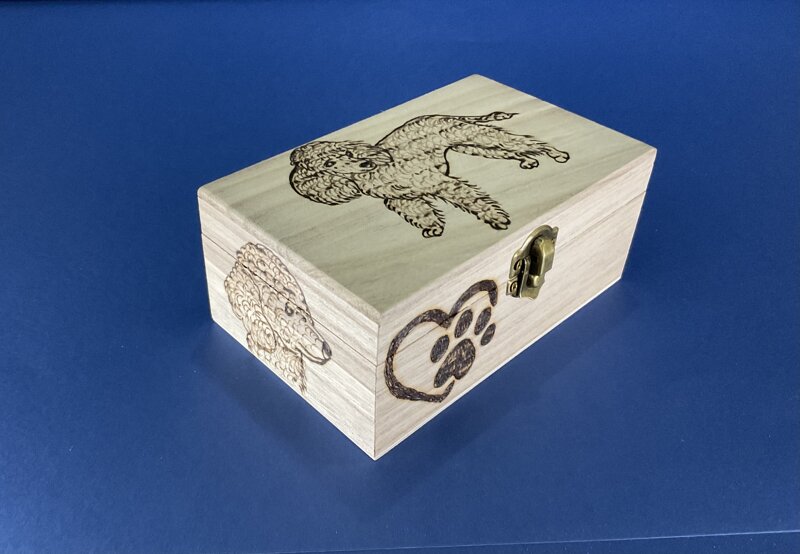cofanetto legno, disegno cagnolino, con chiusura metallica.