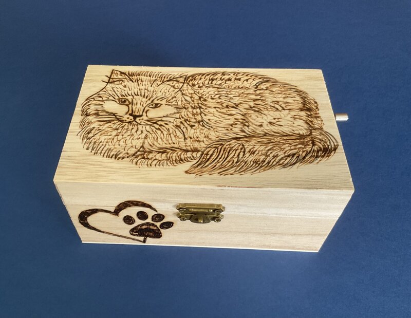 cofanetto legno carillon musica Per Elisa, disegno gattino, con chiusura metallica.