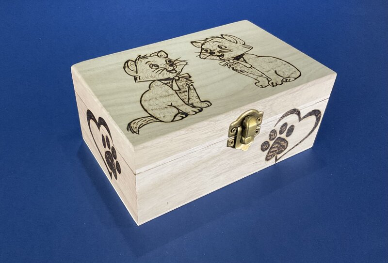 cofanetto legno, disegno 2 gattini, con chiusura metallica.