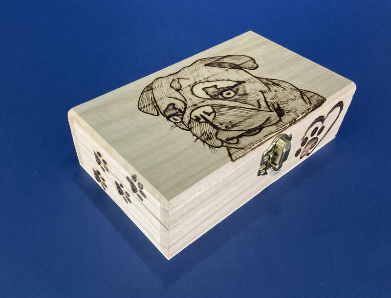 cofanetto legno, disegno bulldog, con chiusura metallica.