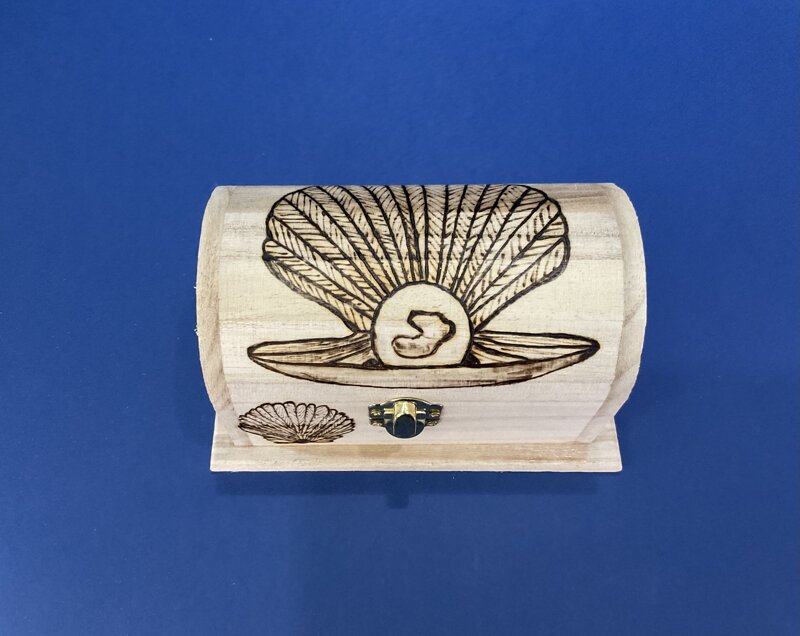 cofanetto legno a scrigno, disegno ostrica, con chiusura metallica.