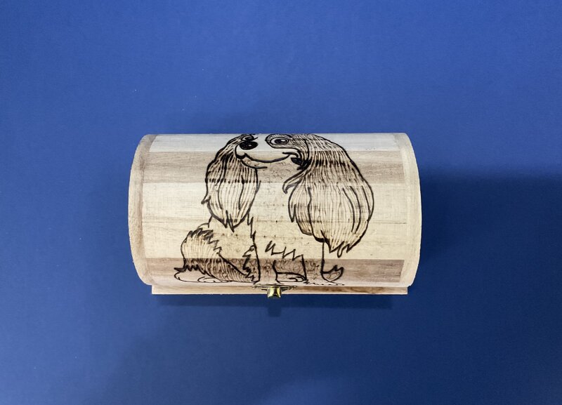 cofanetto legno a scrigno, disegno cagnolino, con chiusura metallica.