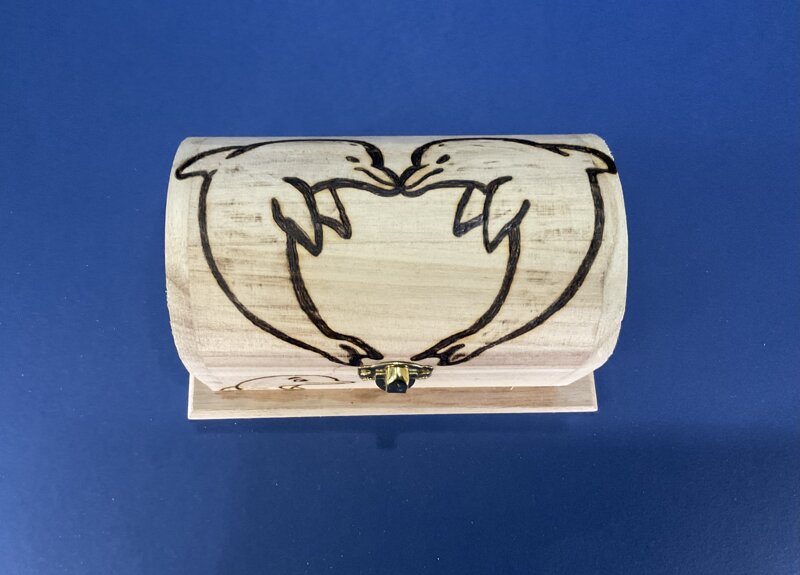 cofanetto legno a scrigno, disegno delfini, con chiusura metallica.