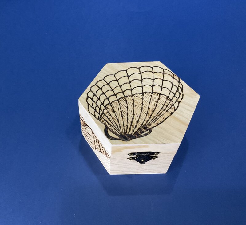 cofanetto esagonale legno, disegno conchiglia, con chiusura metallica.