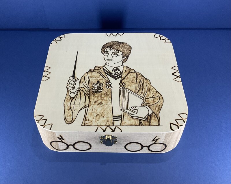 cofanetto legno, disegno cartoni animati, con chiusura metallica.