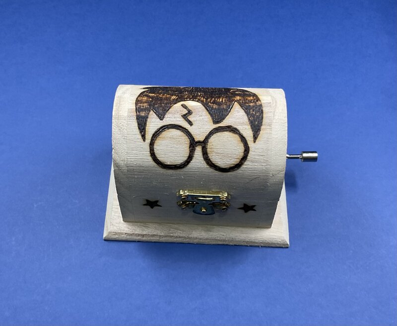 mini cofanetto legno a scrigno carillon musica H.P., disegno cartoni animati, con chiusura metallica.