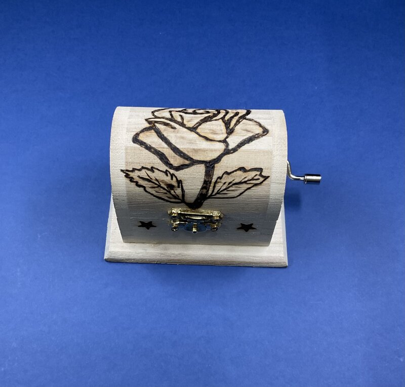 mini cofanetto legno a scrigno carillon musica Buon Compleanno, disegno floreale, con chiusura metallica.