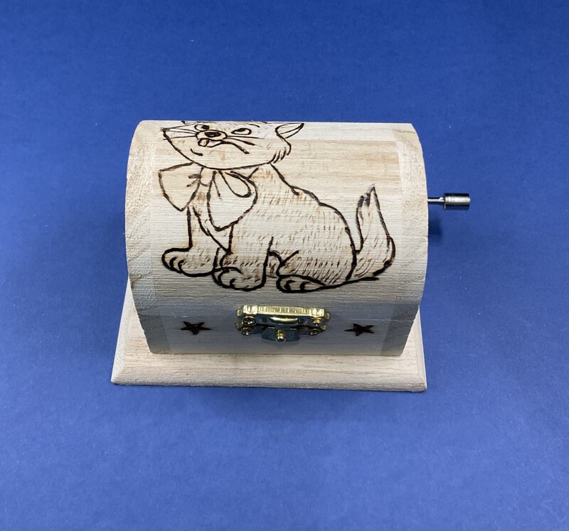 mini cofanetto legno a scrigno carillon musica Romeo e Giulietta, disegno gattino, con chiusura metallica.
