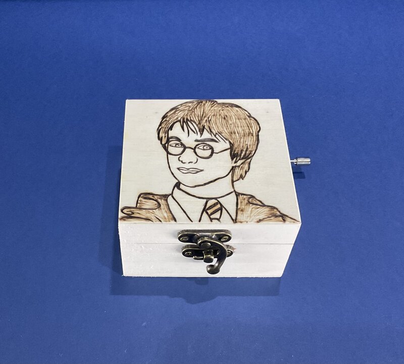 cofanetto legno carillon con musica H.P., disegno H.P., con chiusura metallica.